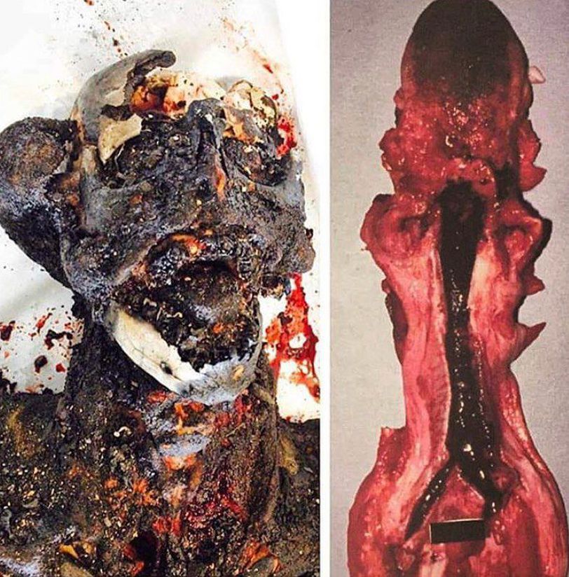 The question that is most commonly asked when it comes to these kinds of deaths is; Were the victims alive during the burning process? There are different stages that the body goes through while burning. In some cases the larynx and trachea or the trachea alone gets dissected (right picture). If soot can be found, then it means that the person was still breathing during the fire. It is a result of smoke inhalation or just burns that lead to the death of the individual. If soot can not be found, then this person was most likely dead before the fire.