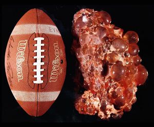 Note how huge this kidney is, with the parenchyma completely replaced by large cysts, approaching the size of a football! Polycystic kidney disease is a genetic, autosomal dominant disorder marked by bilateral enlargement with large cysts bulging through the surface. This disorder can be expressed at any point of life and is very common, occurring in 1 out of every 500 adults. The cysts typically range from 3-4 centimeters in diameter and are filled with serous, turbid, or hemorrhagic fluid. As seen above, multiple cyst formation can cause the kidney to grow as big as a football if not bigger! Signs and symptoms include hematuria, low back pain, and hypertension. Many will present with normal renal function until middle adulthood. Common anomalies associated with this condition include liver cysts, berry aneurysms, and most commonly coarctation (narrowing) of the aorta. Complications include acute myocardial infarction (from chronic hypertension) and renal failure (from destruction of nephrons). Unfortunately, 30% of these patients die from the complications of renal failure. Diagnosis is confirmed through ultrasound used to visualize the cysts. Tolvaptan (Jynarque) was recently approved by the FDA for patients with rapidly progressing ADPKD. Also, moderate dietary restrictions, eating an anti-inflammatory diet, and medically regulated fasting have shown effectiveness in slowing down its progression. On the other hand, if renal failure does occur, dialysis and/or renal transplant are considered the best chance of survival. Photo by Wordpress.com