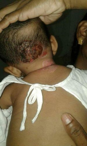 H/O: 11 months old baby girl having Fever since 1 week, severe itching, redness on surrending effected area.