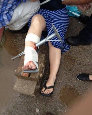 A heroic teacher who shielded her students from a monster tornado is recovering in the hospital after the metal leg of a desk speared her in the calf. S. H. says she's grateful to be alive, and that the incredible injury she sustained isn't life-threatening. "It didn't hit the bone. It just went through the muscle." S.H. said she and another teacher immediately rushed the children under desks and into the corner of the classroom as the twister bore down. "We could hear it approaching. It sounded like a jet ... coming closer and closer." As the storm intensified, she and the students began praying. The roof blew off and a wall crashed down on their bodies. At some point, the leg of a desk impaled her right calf. In about 10 minutes after the storm passed, rescue workers arrived to pull everyone from the rubble. Fortunately everyone survived. Credit: New York Daily News