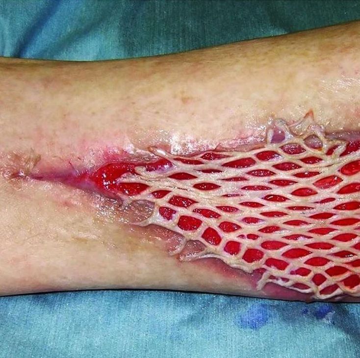 Probably the coolest thing, a mesh skin graft can be either full or partial thickness sheet of skin used for the reconstruction of wound closures that cannot be closed primarily. The tiny holes, or fenestrations on the skin are made to allow the graft to be expanded to cover large defects, provide a route for drainage of blood or serum that may accumulate under the graft, which helps reduce tension and the risk of infection and improve vascularization, and increase the flexibility of the graft so that it can conform to uneven shapes. The healing occurs as the spaces between the mesh fill in with new skin growth.