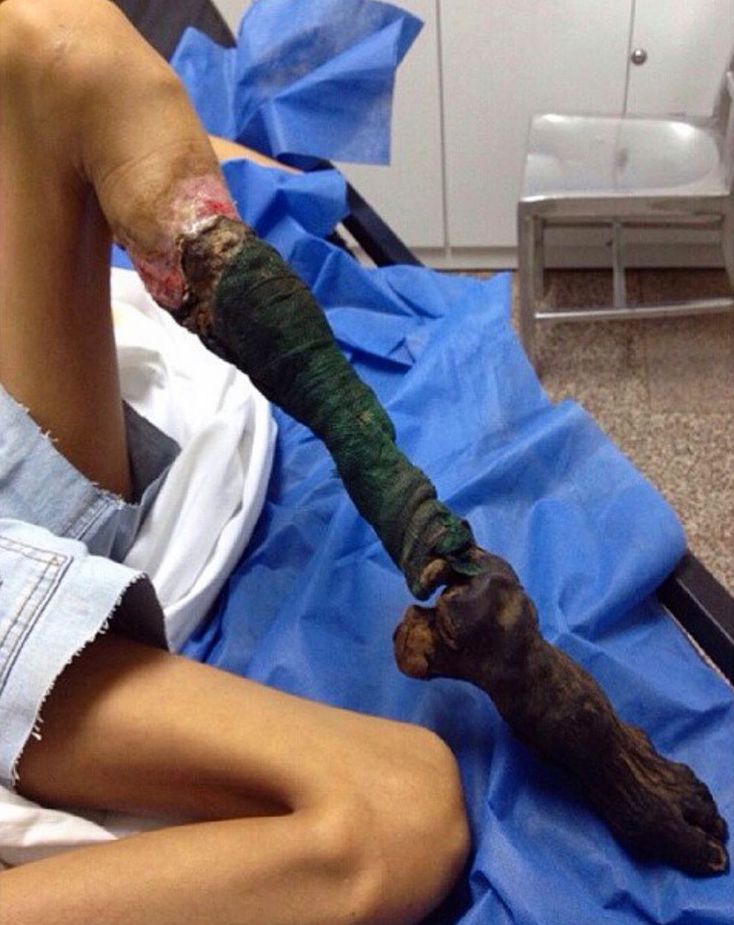 Snake bite left this patient with a “black stick” leg due to severe necrosis!! A 13-year-old girl has apparently been left with a horrifically blackened and shrivelled leg after a snake bite caused her muscle cells to wither and die. The Venezuelan teen developed necrosis and gangrene of her left lower extremity due to a snake bite that was treated only with local indigenous remedies for a month before she was brought to a hospital. By this time she had developed a severe case of necrosis which in turn has led to a condition called rhabdomyolysis which can cause muscle tissue throughout the body to die. Snake venom is very complicated and depends on the species of snake. But the picture shows clearly severe tissue necrosis that will need amputation. The whole lower leg is black. It’s spreading up. Looking at the rest of her body, she’s showing signs of muscle wastage from the poison and her other leg is thin. A typical bite from a venomous snake will result in the presence of two puncture wounds from the animal's fangs. This may result in redness, swelling, and severe pain at the area, which may take up to an hour to appear. As the bite goes untreated, it often leads to localized soft tissue necrosis. Less frequently victims may suffer extensive muscle damage leading to rhabdomyolysis to due a myotoxin found in the venom. First aid steps you can take after a snake bite occurs include cleaning the wound, remaining calm, and immobilizing the affected area. However, it’s essential to get to a medical facility immediately for emergency treatment. If treated in time, the outlook for recovery is good. Photo credit to @juventudmedica
