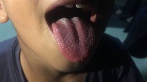 7 year boy had fever for 2 days with flush and reddish face and enlarged pappillae on the tongue. He also had some rashes on the hands like urticaria.