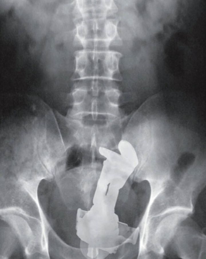 The majority of cases of rectal foreign bodies are the result of insertion during erotic activity. Typically found objects are vibrators, dildos, light bulbs, candles, shot glasses, and bottles. Some rectal foreign bodies may have been initially swallowed but later present with complications in the rectum. Patients may be very embarrassed to disclose the circumstances regarding the foreign body insertion, and there may have been multiple attempts at self-removal. Typical clinical findings of a rectal foreign body are pain with defecation, abdominal pain, rectal bleeding, pruritus, and constipation. Delays in seeking medical attention and multiple attempts at self-removal can lead to mucosal edema and muscular spasms, making removal of the object more difficult.