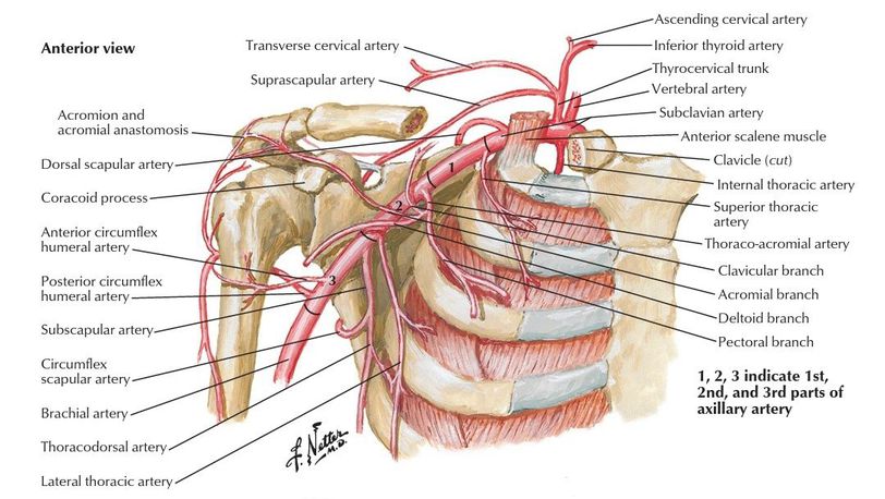 Memorizing the intricate details of anatomy tends to be vexing and proves to be volatile! Mnemonics certainly help along with lots of revision and image visualization. The axillary artery, a continuation of the subclavian artery gives off 6 branches to supply the thoracic, scapular, and humeral regions. An effective way to memorize them is the following mnemonic: Six Teens Love Songs And Poems The arteries are: Superior thoracic, Thoracoacromial, Lateral thoracic, Subscapular, Anterior circumflex humeral and the Posterior circumflex arteries. (Image Courtesy: Netter's Atlas of Human Anatomy)