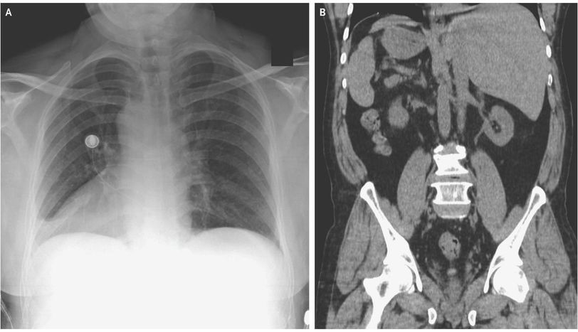 Situs Inversus Totalis is a congenital condition in which the positions of the left and right sided organs are reversed. In such people, the heart beats on the right side! Other organs such as liver and spleen are also present on the other side of the body, as revealed by the image above. This anomaly may be associated with a defect in ciliary function, thus leading to frequent respiratory infections and infertility. The disease is referred to as the Kartagener’s Syndrome. (Image via: https://www.nejm.org/doi/full/10.1056/NEJMicm1811002 )