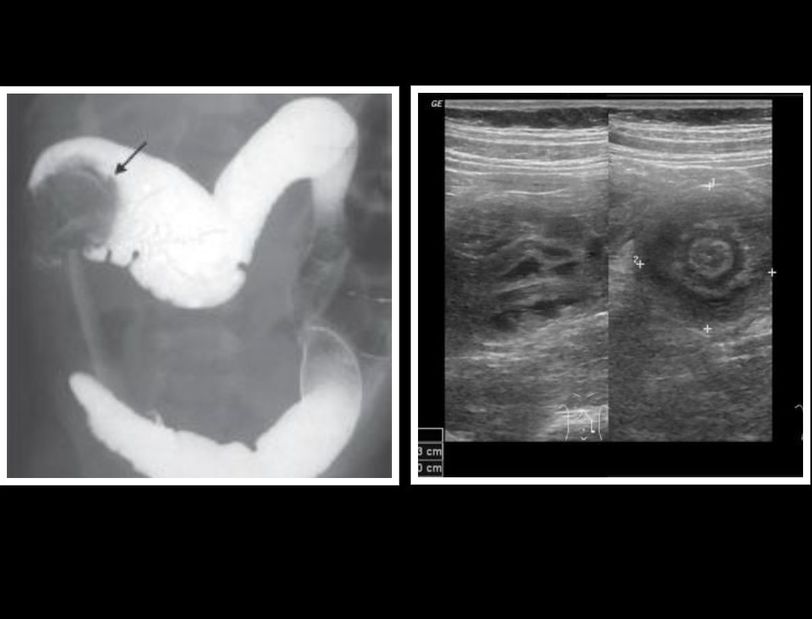 The left image shows CLAW SIGN after a barium enema whereas the right image reveals DOUGHNUT or TARGET SIGN on ultrasound. Both these radiographic findings can be seen in a condition called intusussception. In this condition, a segment of bowel slides into the lumen of the adjacent bowel. It may occur either due to the presence of a pathological entry point such as duplicated intestine or polyp, or it may be associated with intestinal malrotation. The child presents with constipation and on abdominal examination, a sausage shaped swelling may be palpated with convexity facing the umblicus. The right iliac fossa may be empty on palpation. There may be a history of passage of red currant jelly like stool. The ultrasound reveals target or doughnut sign which is actually an intestinal loop within loop. Barium enema reveals claw sign at the site where intusussception has occurred. Image credits: https://radiopaedia.org/cases/intussusception-transient-small-bowel?lang=gb https://www.jaypeedigital.com/book/9789385999000/chapter/ch4