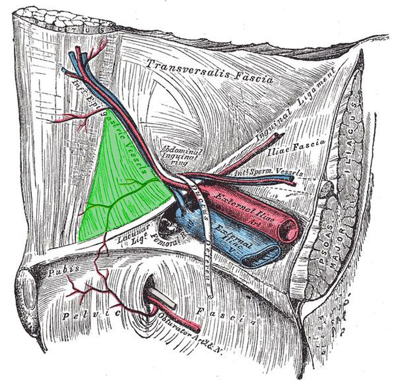 The Hasselbach's triangle is an area in the lower portion of the anterior abdominal wall. It is the site through which most direct inguinal hernias protrude. The simplest way to memorise its boundaries is by remembering that the hernia can RIP through the triangle! R- Rectus sheath (lateral border) medially I- Inferior epigastric artery laterally P- Poupart's/ Inguinal ligament inferiorly