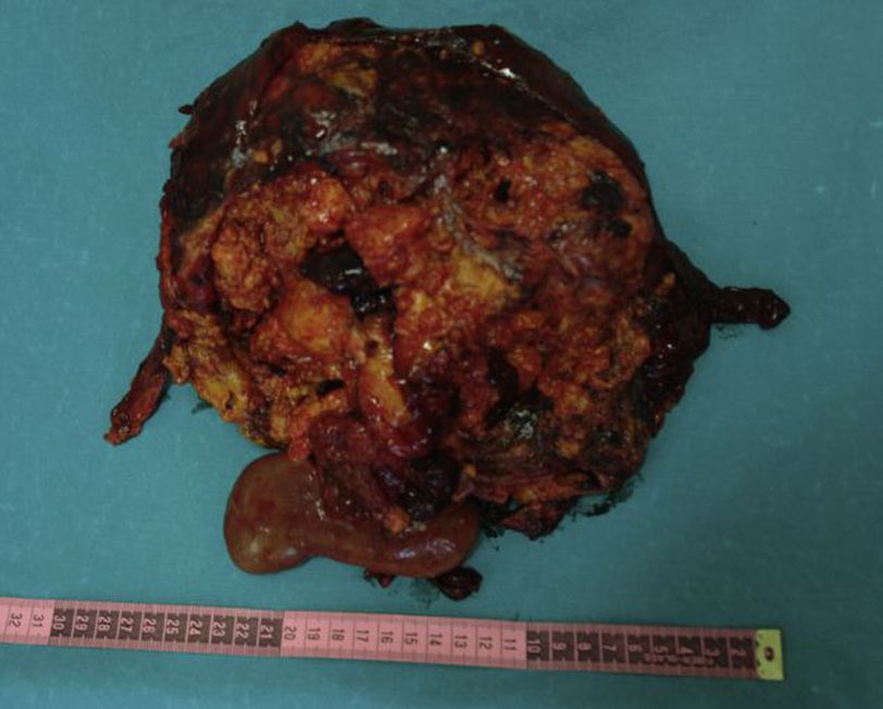 Angiomyolipoma is a rare benign tumor that most commonly arise in kidneys; spleen, liver and uterus may also develop angiomyolipoma sporadically. Most of the cases of renal angiomyolipoma are associated with tuberous sclerosis. Renal angiomyolipoma is typically asymptomatic, hence the finding is incidental. However, few conditions predispose individual to spontaneous rupture of the said tumor. These risk factors include coagulopathy, post-partum hemorrhage and trauma to kidneys. Renal angiomyolipoma has typical presentation as denoted by Lenk’s triad: gross hematuria, flank pain and a palpable mass that is tender on touch. One of the dreaded complications of renal angiomyolipoma is Wunderlich Syndrome. The incidence of Wunderlich syndrome is 10% in patient with renal angiomyolipoma. It refers to spontaneous rupture of the tumor, resulting in excessive retroperitoneal hemorrhage and secondary hypovolemic shock. Wunderlich syndrome is an indication of urgent laparotomy and exploration to control the hemorrhage. Nephrectomy is usually considered in order to prevent future episodes of spontaneous rupture. Nephrectomy may also be done if kidney cannot be salvaged due to rupture of associated mass. Source: Spontaneous rupture of a giant renal angiomyolipoma—Wunderlich’s syndrome: Report of a case https://www.ncbi.nlm.nih.gov/pmc/articles/PMC4756198/#:~:text=Renal%20angiomyolipoma%20(AML)%20is%20an,painful%2C%20and%20occasionally%20life%20threatening. Image shows ruptured renal angiomyolipoma resulting in excessive hemorrhage. (via https://www.ncbi.nlm.nih.gov/pmc/articles/PMC4756198/#:~:text=Renal%20angiomyolipoma%20(AML)%20is%20an,painful%2C%20and%20occasionally%20life%20threatening.)
