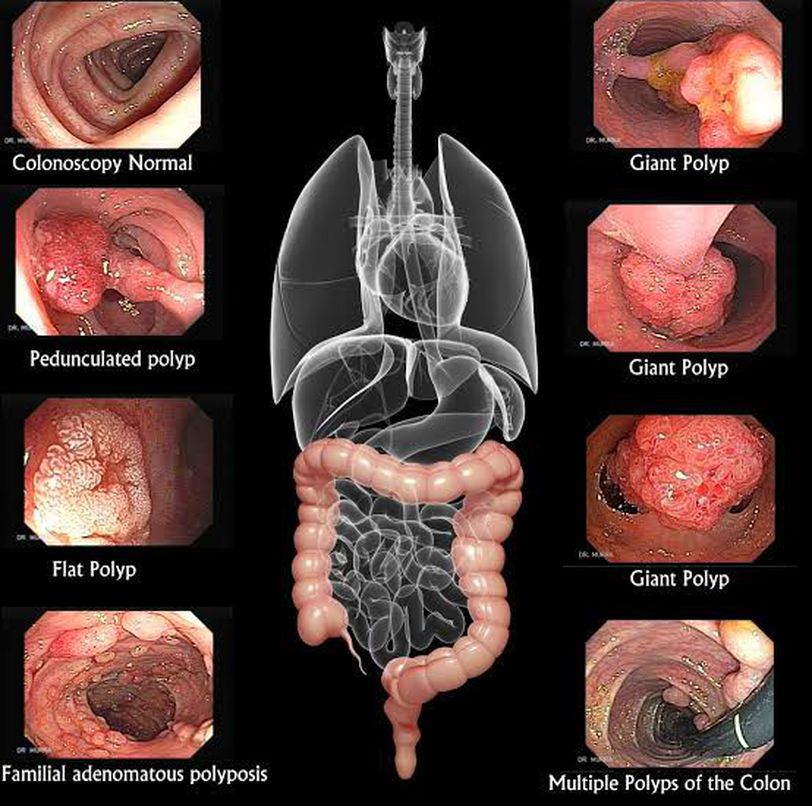 Polyps are mucosal outgrowths protruding into the organ's lumen. They are frequently encountered in the rectum and sigmoid colon. They can be of the following types: 1. Inflammatory pseudopolyps: They are formed as a result of edema of the mucosa and are usually associated with colitis. 2. Juvenile polyps: These are bright red and pedunculated, also referred to as cherry tumours. When solitary, they pose no risk of malignancy but if multiple, they might carry an increased risk of neoplastic changes. A characteristic histological feature is the presence of mucous filled spaces within the polyp. 3. Hyperplastic polyps: These polyps are small, sessile and often multiple. They do not usually carry a malignant potential. 4. Adenomatous polyps: These may be of the tubular, villous or tubulovillous variety. They have an increased risk of malignancy, especially if their size exceeds 1cm. FAP or familial adenomatous polyposis is a hereditary disorder characterized by numerous adenomatous polyps in the colon. This condition necessitates prophylactic colectomy to prevent the occurence of colonic adenocarcinoma. Ideally all polyps should be biopsied or removed to exclude cancer! Image via: http://www.gastrointestinalatlas.com/murrasaca/english/polyps.html Source: Bailey and Love's Short Practice of Surgery