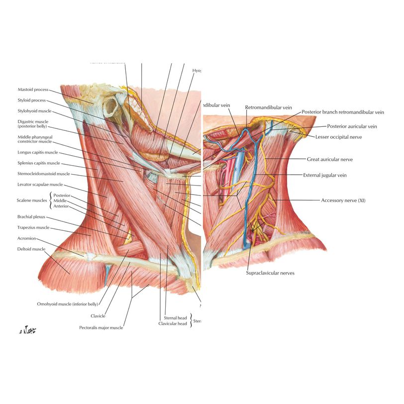 Triangles of the neck are important surgical landmarks in head and neck surgery. The posterior triangle is bound anteriorly by the sternocleidomastoid and posteriorly by trapezius. The inferior boundary is formed by the middle third of the clavicle. The bed of the triangle is formed by the scalene muscles below and splenius capitis superiorly. Important structures passing through the triangle are the accessory nerve (CN XI) and the proximal portions of the brachial plexus. These need to be safeguarded during procedures of the posterior triangle. Image via: Netter's Atlas of Human Anatomy