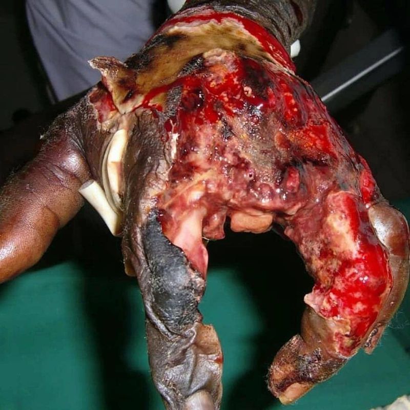 This 13-year-old boy presented to the hospital because of a snakebite on his left hand that had occurred six hours before. He was hunting bush rats, and when he put his hand in a hole, he was bitten. On arrival he showed clinical hemorrhagic syndrome with gingival bleeding and an edema extending to his back and shoulder. Just after his admission, he received the first dose of antivenom in association with the usual non-specific treatment (tetanus toxoid, tetanus vaccination, amoxicillin, acetaminophen, and ibuprofen). Due to persistent swelling (the edema reached the thorax) he received a second dose of antivenom six hours after the first. Then, the edema stopped increasing and there was no more clinical bleeding. Although the edema stopped growing, the hand still had a worrying aspect. The skin was very hard, nails were white, without any evidence of blood circulation. A physical examination showed sensory and movement deficits. The patient underwent surgery on Day 1. Perioperative observations showed hand compartment syndrome and deep hematomas. Fasciotomy was performed and muscles below were black with almost no blood flow. The patient went back to the operating room every 2 or 3 days in order to clean the wound and remove necrosis. Unfortunately it extended to the whole hand. Finger amputations were necessary. After eight surgeries, his condition finally improved and the clean wound allowed a skin graft. Unfortunately, the patient 'escaped' at Day 25 of hospitalization, before the doctors could perform the skin graft. To be outside with such a wound and no sanitary supplies makes a good prognosis nearly impossible. Credit: @medicmad