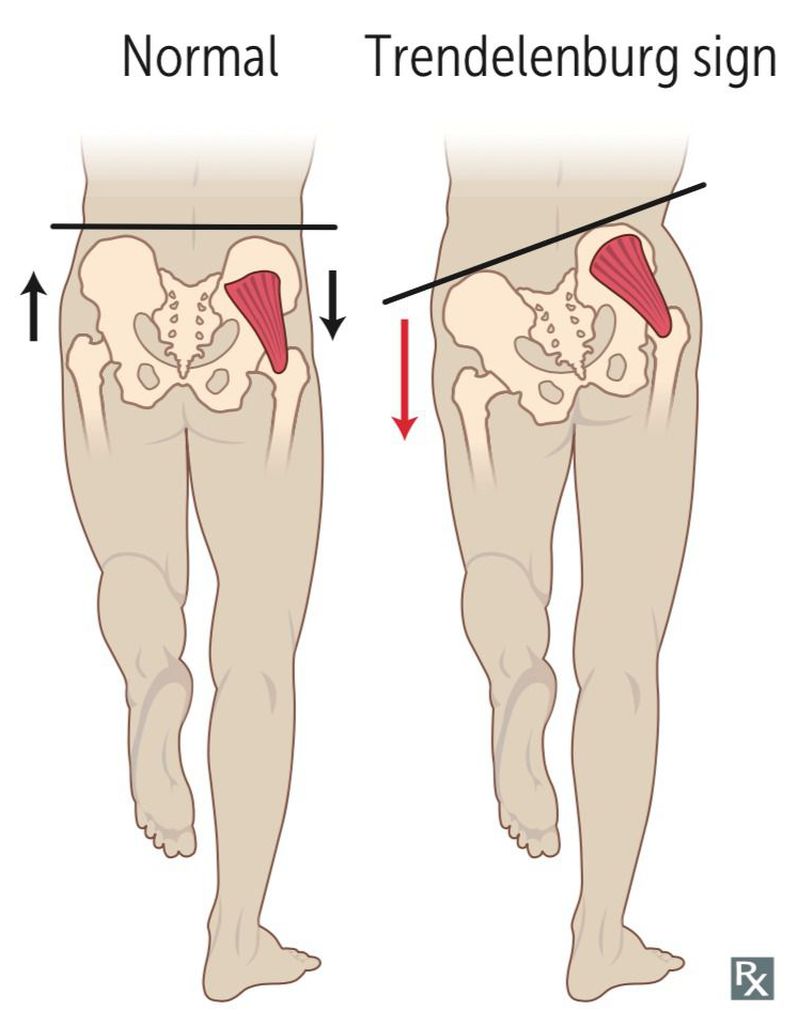 During the normal gait cycle, the pelvis is kept leveled during all phases by gluteus medius. However, in a person having superior gluteal nerve lesion, pelvis cannot be lifted. When such a person is asked to stand on one leg, the pelvis descends on the side of the unsupported limb, thus indicating paralysis of gluteus medius of the opposite, supported limb. This is known as a positive trendelenburg sign. The superior gluteal nerve may be damaged in a variety of conditions including hip joint dislocation, pelvic fractures and even misplaced intragluteal injections. Image via: https://www.pinterest.com/pin/482377810085361367/