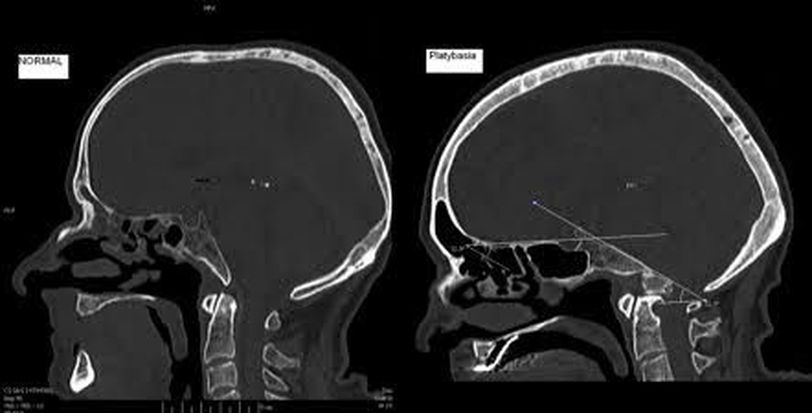 Platybasia is characterized by flattening of the skull base and a skull angle- the angle between anterior base of skull and clivus- is over 140°. In platybasia, the floor of the posterior cranial fossa buldges upward. The upper cervical vertebrae may be displaced superiorly and brainstem might be impimged leading to neural deficits. It can be congenital or aquired. Aquired causes include pagets disease, osteomalacia, rickets, trauma etc. Congential causes include achondroplasia, down's syndrome, osteogenesis imperfecta, craniocleidodysostosis etc. Image via: https://images.app.goo.gl/Vx1AdRgYm7ozZmy46