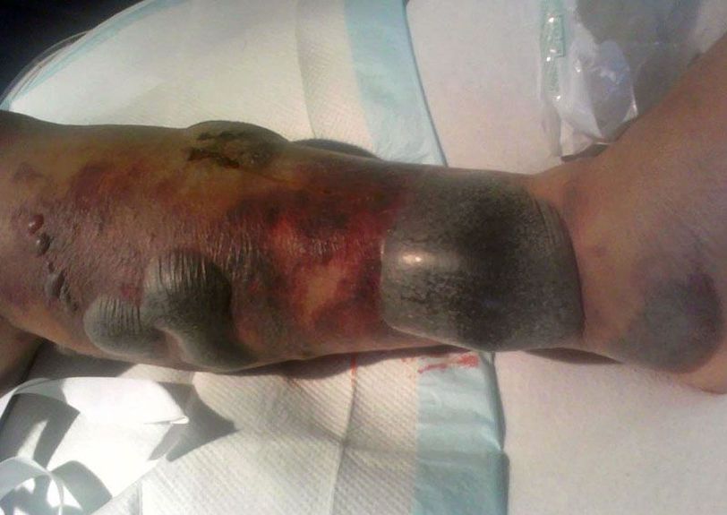 Necrotizing fasciitis is an aggressive bacterial infection that results in decaying of the soft tissues. Though rare, it is associated with high morbidity and mortality. Individuals with compromised immune function such as those with AIDS, diabetes, cancer, and chronic alcoholics prone to develop necrotizing fasciitis. History of trauma, surgery, and burns is an additional risk factor. Necrotizing fasciitis can occur anywhere throughout the body; however, commonly involved sites are extremities, perineum, limbs, and genitals. Most common signs and symptoms of necrotizing fasciitis is red discoloration of affected part, necrosis, anesthesia, and subcutaneous emphysema; other local symptoms may include pain, swelling, and hemorrhagic bullae. These are typically accompanied by systemic symptoms like fever and vomiting. Necrotizing fasciitis is can broadly be divided into nonmicrobial and polymicrobial on the basis of number of organisms involved. Group A Strep is the most common causative agent of necrotizing fasciitis. Gold standard modality for diagnosis is CT scan. Necrotizing fasciitis is a serious condition and requires aggressive in-hospital management. IV fluids are started as soon as the patient is admitted. Empirical broad-spectrum antibiotics are administered without waiting for laboratory investigations. A surgical team is consulted for the removal of dead tissues. Differentials diagnosis of this condition can be cellulitis, abscess, deep vein thrombosis, and pyomyositis. Suspicion of index for necrotizing fasciitis should be high as ER physicians are usually reluctant to make such diagnosis without confirmatory investigations. Timely diagnosis and management are imperative for better prognosis. Source Necrotizing Fasciitis https://escholarship.org/uc/item/2fk1s1cm Image via https://www.dermatologyadvisor.com/home/decision-support-in-medicine/dermatology/necrotizing-fasciitis-synergistic-necrotizing-cellulitis-fourniers-gangrene-hemolytic-streptococcal-gangrene-meleneys-ulcer-suppurative-fasciitis-ludwigs-angina/
