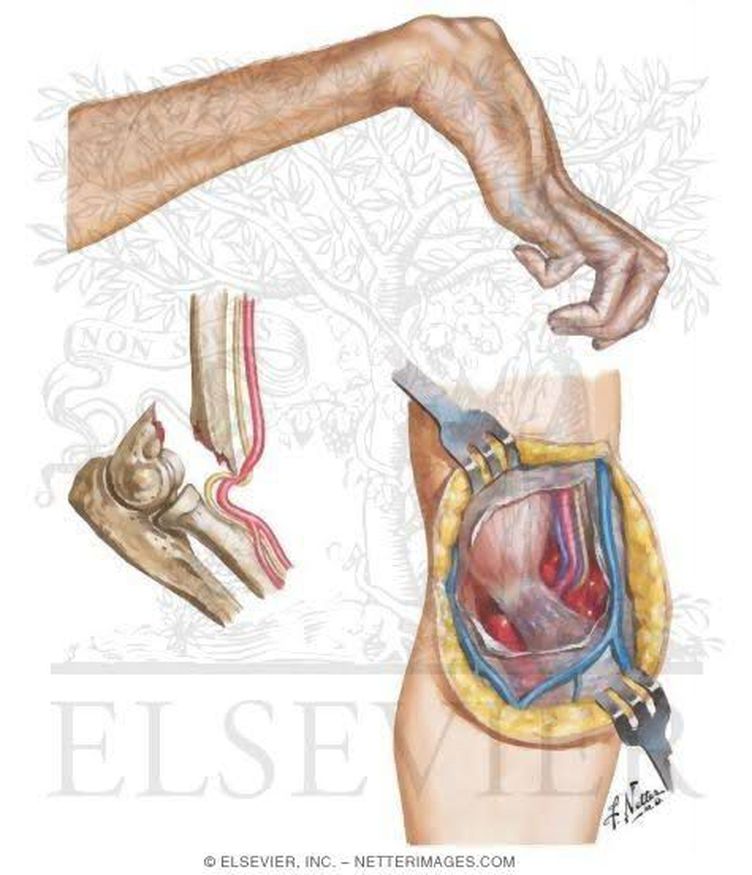 This permanent contracture is a dreaded complication of vascular insult of the upper limb. It is seen in supracondylar fractures of the humerus which compromise the brachial artery. It is also seen in neglected compartment syndrome and crush injuries. Ischemia results in deformities of the flexor tendons of the forearm along with intrinsic muscles of the hand. There is coexisting neurological deficit, especially involving the ulnar and median nerves. Image source: https://www.netterimages.com/volkmanns-ischemic-contracture-unlabeled-orthopaedics-frank-h-netter-2458.html
