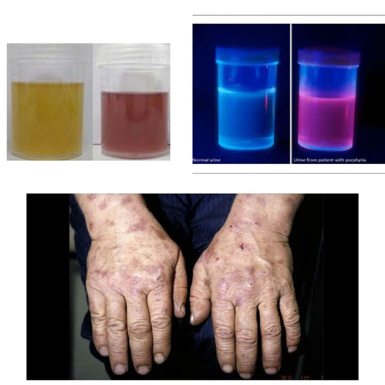 Porphyrias are rare, inherited or sometimes aquired, disorders which result from a defect in the heme synthesis pathway due to an enzyme deficiency. This defeciency leads to the accumulation and increased excretion of porphyrins or their precursors. Whenever there is an enzyme defect leading to accumulation of tertrapyrrole rings, patients present with photosensitivity. Porphyria cutanea tarda, the most common porphyria, belongs to the group of chronic hepatitic porphyrias. There is a deficiency of enzyme uroporphyrinogen decarboxylase. Factors like exposure to sunlight, hepatic iron overload, estrogen therapy, infections like hepatitis B or C and HIV and alchohol ingestion can exacerbate the expression of disease. Patients usually present during their 4th or 5th decade with photosensitivity, skin lesions like slowly healing skin eruptions and blisters, crusting and scarring of skin, hyperpigmentation, increased hair growth, especially facial. Urine is red to brown in natural light and pink or red in fluorescent light. Treatment may include phlebotomy, use of iron chelators or low doses of anti-malarial drugs like chloroquine or hyrdroxychloroquine. PCT is a risk factor for developing liver cirrhosis hence, life style changes should be adapted like avoiding alcohol and smoking, avoiding sunlight and application of sunscreen. Intake of estrogen should also be discontinued. Image via: https://images.app.goo.gl/66wCBZ1VQFzERHKW9 https://images.app.goo.gl/zWPzUSXUkwdGZpLy7 https://images.app.goo.gl/3pVoW1XruWaqF9hXA