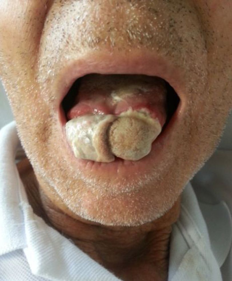 Giant Cell Arteritis (GCA) is a type of vasculitis which commonly involves medium and large sized vessels. Headache, jaw claudication, amaurosis fugax and vision loss are the most common symptoms seen in this condition but tongue necrosis is relatively rare, due to its rich vascular supply. Below is a case of 85 year old, hypertensive male, who presented in Emergency Department with a severe fronto-temporal headache along with jaw pain. The patient had been suffering from mild to moderate headache and jaw pain for the past 30 days. However, the headache increased in severity for the last 7 days along with jaw pain which involved floor of the mouth as well as the chin. Past medical history revealed cataracts and osteoporosis. The patient was suspected for GCA, on the second day of admission the patient suffered severe pain in the tongue and was not able to eat anything. On inspection, lingual volume was increased along with edema and white plaques. A lingual swab was taken which later revealed oral candidiasis. The patient was put on fluconazole therapy. Within 24 hours the color of tongue changed from white to grey, indicating lingual ischemia. Temporal pulses were absent and bilateral amaurosis was seen. Complete Blood count showed highly raised ESR and CRP as well as mild leukocytosis and anemia, indicating an acute inflammatory crisis. A doppler ultrasound and biopsy was taken which confirmed the diagnosis of Giant Cell Arteritis. The patient was put on 1mg/kg/day Prednisone followed by methotrexate 10mg/ week. After 14 days the necrotic area of the tongue detached itself on its own from the healthy tissue. Late, the Prednisone dose was tapered off to 20mg/kg gradually and the patient was discharged.