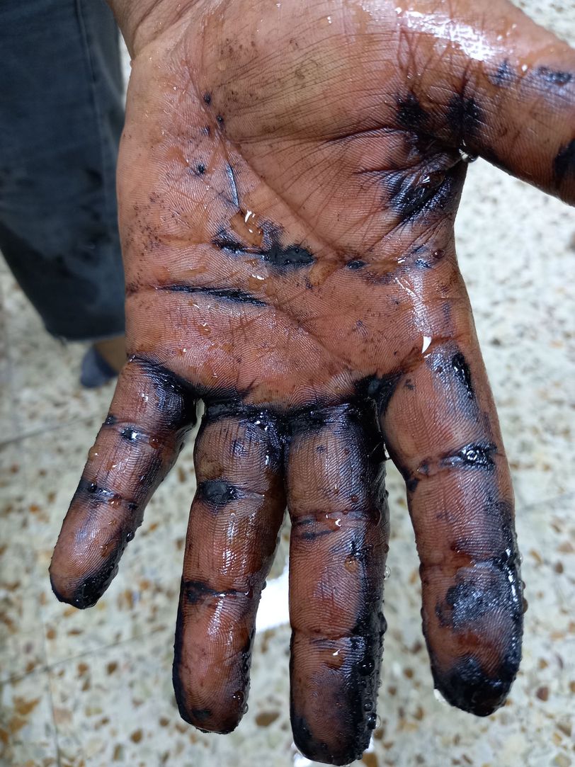 Young male at alsadir city baghdad / imam ali hospital , presented after tar burn , when presented to hospital tar was not hot , and wash the hand by normal saline , and theres is was no tween 80 , or disolvit cream , for that wash it carefully and try to clean and then use neosporin cream , burn gauze , and call hom to come back after 48 hours to clean all residual tar and remove it .