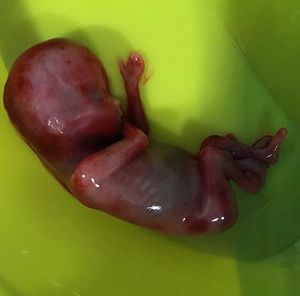 A miscarried fetus due to maternal complications early in pregnancy!! This woman presented with vaginal bleeding at 13 weeks gestation. After approximately 3 hours of bleeding she sadly passed this fetus. It was sent off to the anatomical pathology lab for testing. Amazing to see the little ribs, feet, and even ears at such a young age! Miscarriage is the natural or spontaneous end of a pregnancy at a stage where the embryo or the fetus is incapable of surviving, generally defined in humans at a gestation of prior to 20 weeks. It is an unfortunate thing to deal with, and many medical complications during early pregnancy can lead to it such as an infection, uterine and hormonal abnormalities, unhealthy lifestyle, drug and alcohol usage and smoking, exposure to environmental and workplace hazards, immune system problems, and list goes on and on. In addition, women may be at increased risk for miscarriage as they age. When a miscarriage occurs, the tissue passed from the vagina should be examined. This is done to determine if it was a normal placenta or a hydatidiform mole (a rare growth that forms inside the womb early in pregnancy). When looking for gross or microscopic pathologic symptoms of miscarriage, one looks for the products of conception. Microscopically, these include villi, trophoblast, fetal parts, and background gestational changes in the endometrium. Genetic tests may also be performed to look for abnormal chromosome arrangements.