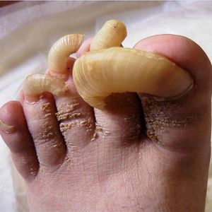 Onychogryphosis! Toenails look way too long and badly neglected! Onychogryposis is a thickening and increase in curvature or curling of the nail, resembling claws. An affected nail may have many grooves and ridges, is usually brownish in color, and grows more quickly on one side than on the other, involving the great toe more commonly. It is the result of injury to the matrix, sometimes coupled with a long term fungal infection, which causes the nail to grow more thickly. It may be partially hereditary and is also caused by trauma or peripheral vascular disease, but most often secondary to self-neglect and failure to cut the nails for extended periods of time, seen in elderly. The thick curved nail is difficult to cut, and often remains untrimmed, exacerbating the problem. Treatment consists of avulsion of the nail plate with surgical destruction of the nail matrix with phenol or the carbon dioxide laser, if blood supply is adequate.