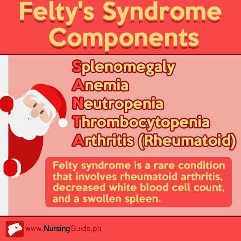 Felty's syndrome is seen in association with rheumatoid arthritis. This disease is seen in patients who are seropositive for RF (Rheumatoid Factor) and usually have long standing arthritis. Females aged 50-70 years are more commonly affected. The above mentioned mnemonic can help memorize its components forever! Image via:https://www.pinterest.com/pin/470485492320309619/