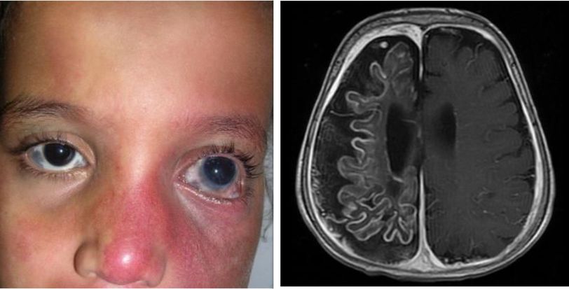 Sturge-Weber Syndrome (SWS) is a non-inherited genetic disorder that results in malformation of vasculature of brain, eyes, and skin. It presents with classic triad: 1. Facial port wine nevus 2. Ipsilateral leptomeningeal angioma 3. Glaucoma Sturge-Weber arises due to somatic mutation in GNAQ gene, which subsequently impairs signaling pathways. This gene is involved in regulation of development of blood vessels; however, mutation results in defective regulation and subsequent increased growth of blood vessel. STURGE-WEBER SYNDROME MANIFESTATION IN SKIN: Majority of people having SWS have a port wine birthmark. This is usually present on forehead, eyelid, or temple. It is a flat lesion that appears due to increased vasculature and dilatation near the skin. The color ranges from With time, this port wine stain may darken and thicken. STURGE-WEBER MANIFESTATION IN BRAIN: SWS typically affects vasculature of leptomeninges, consequently disturbing the blood supply to brain, resulting in atrophy and calcification of brain matter. People with SWS suffer from stroke-like episodes, causing transient hemiparesis, focal seizures, headaches, and disturbed vision. Over time, SWS results in cognitive disability and usually cause learning impairment similar to ADHD. STURGE-WEBER MANIFESTATION IN EYES: Eye disorder in SWS typically manifest as glaucoma, resulting in loss of vision in infancy or early adulthood. Due to increased intraocular pressure, the eyeballs appear large and bulged out. The manifestation of SWS in eye usually affect the same side as the port wine stain. Source Sturge-Weber syndrome https://medlineplus.gov/genetics/condition/sturge-weber-syndrome/#causes Image via - https://radiopaedia.org/articles/sturge-weber-syndrome-1 - https://emedicine.medscape.com/article/1177523-overview
