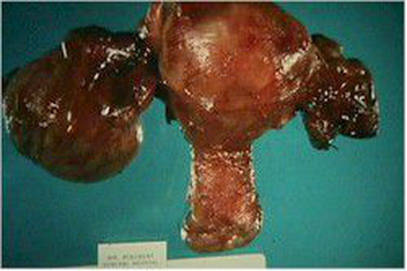 The picture shown above shows a huge ovary adjacent to the uterus. The dark brown color earns it the name chocolate cyst. This is seen most often in a condition called endometriosis in which the uterine endometrial tissue is found in ectopic locations. They could be the ovaries, the rectouterine pouch and even in rare cases, surgical scars and lungs. The tissues bleed cyclically with each menstrual cycle and cause scarring. Chronic bleeds into the ovary result in the formation of these chocolate cysts, also referred to as endometriomas. Image credits- http://www.operationalmedicine.org/ed2/Video/chocolate_cyst_of_the_ovary_vide.htm