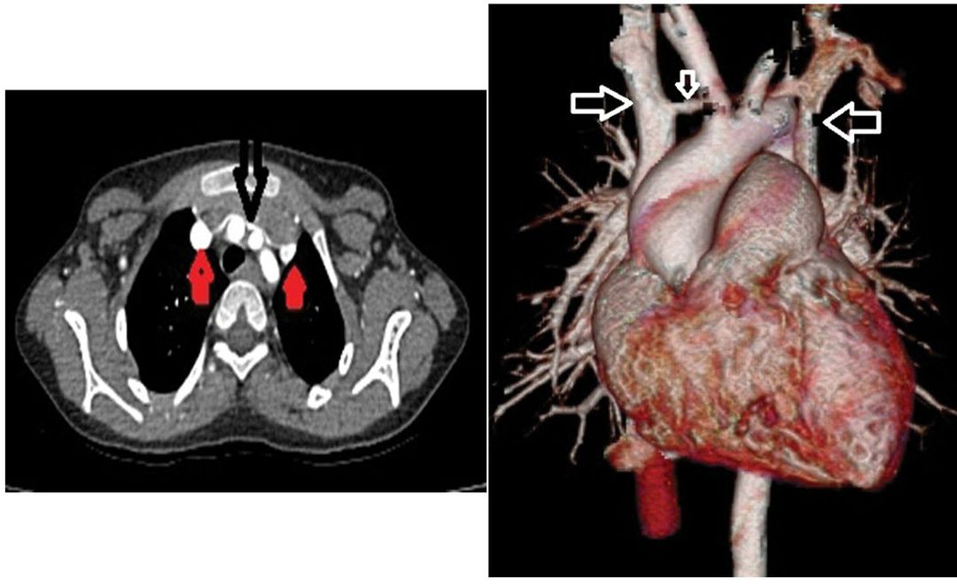 During normal development, the superior vena cava develops from right anterior cardinal and right common cardinal veins. Persistence of the left anterior cardinal vein results in a left SVC. This left SVC drains into the right atrium through the coronary sinus. In the case of double vena cava, the anastomosis between the anterior cardinal veins which forms the left brachiocephalic vein is also small or absent. In above shown figures the double venae cavae can be seen. Axial CECT image shows two superior venae cavae (marked red arrow) and the intercommunicating vein (marked black arrow). In figure 2, 3D Ct angiographic image shows double superior venae cavae (marked horizontal arrows) with the venous inter communication (marked vertical arrow). Images and their description via: https://www.imagejournals.org/articles/double-superior-vena-cava-115.html