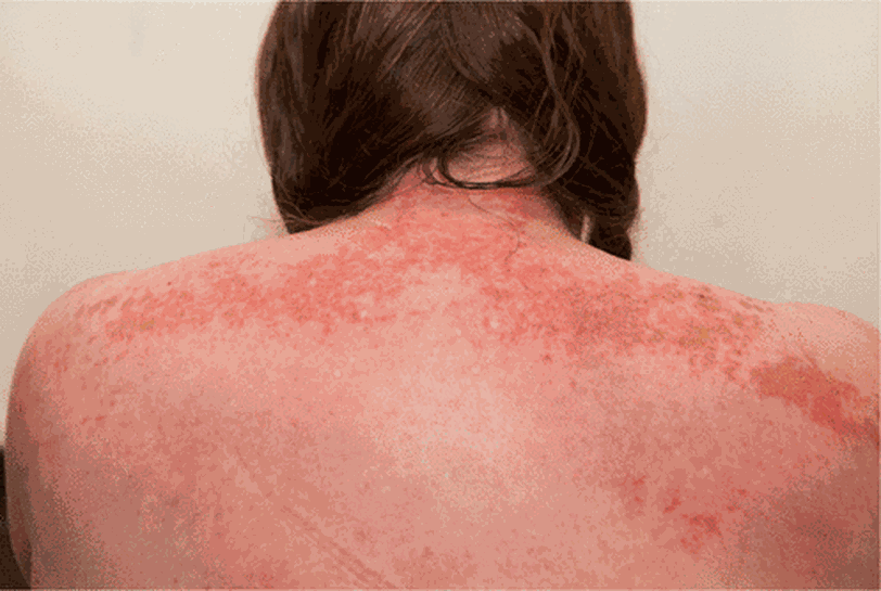 I haven't been able to find a suitable explanation for this particular site involvement. However, the rash is likely immune mediated and UV rays may also have a role, thus, explaining why the V of the neck is involved anteriorly and the upper shoulders and back are affected posteriorly.