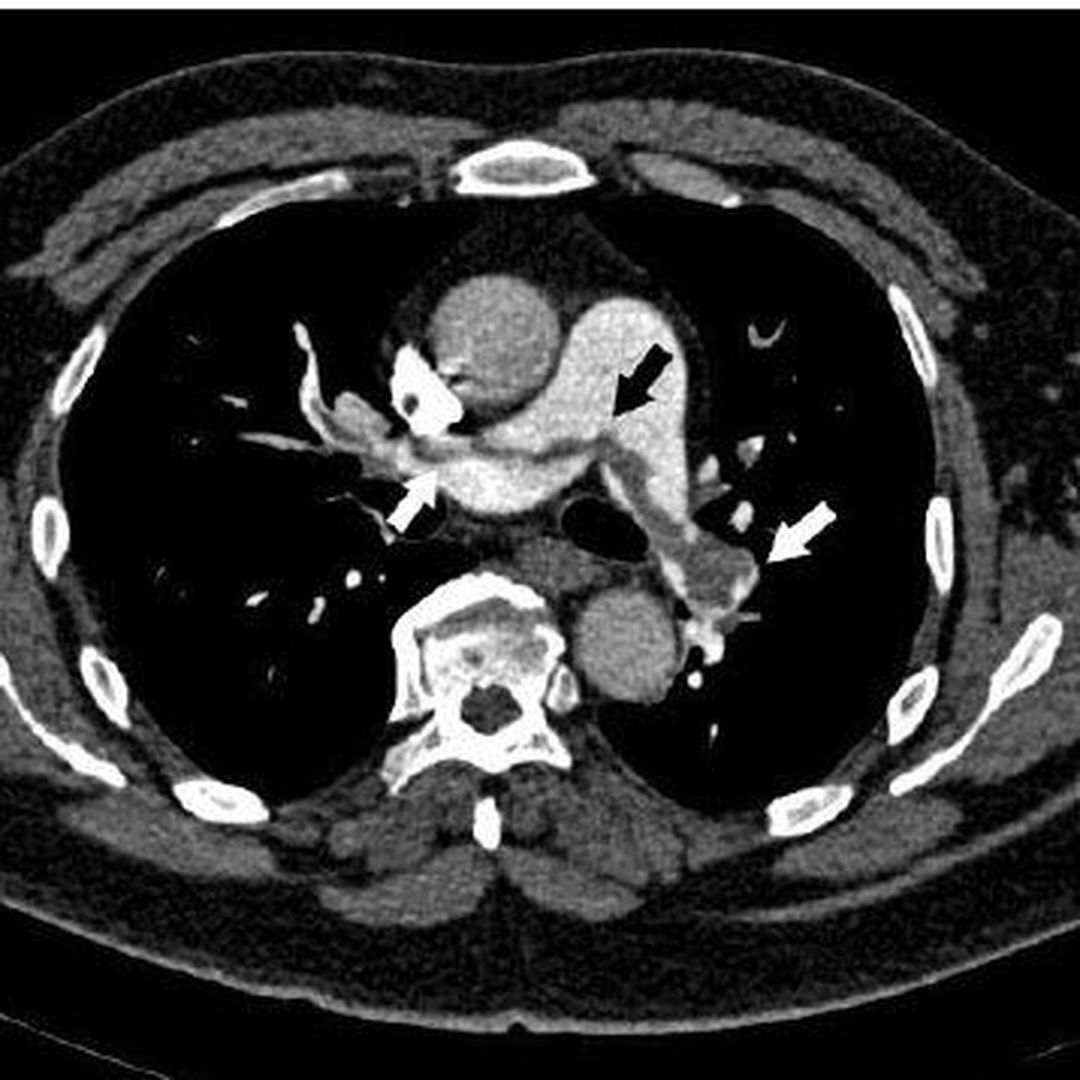 Pulmonary embolism is a potentially life-threatening condition, which occurs due to dislodging of deep vein thrombus/thrombi, resulting in blockage of pulmonary artery. Most common cause of pulmonary embolism is deep vein thrombosis. Pulmonary artery may also be blocked by fat embolism, air embolism, or a fragment of tumor. The symptoms usually depend on the size of the thrombus and the area of the lung involved as well as the comorbidities of the patient. Most common signs and symptoms are: - Shortness of breath: Sudden; worsens with exertion - Chest pain: Sharp pain associated with breathing; cough and bending over also worsen the pain - Cough: Associated with blood-streaked sputum - Irregular, rapid heartbeat - Loud S2 is heard on auscultation. S3 gallop may also be present. - Dizziness - Fever - Sweating - Cold, clammy and/or cyanotic skin Risk factors of pulmonary embolism are: - Family history of pulmonary embolism - Cardiovascular disorders e.g., heart failure - Malignancy: brain and ovarian tumors, CA pancreas, stomach cancer colon cancer, and malignancy of kidneys are associated with increased risk of blood clot formation - Surgery and bed rest: Prolonged immobilization increases risk of deep vein thrombosis and subsequent risk of embolism - Hypercoagulable states - Coivd-19: people with severe symptoms might develop pulmonary embolism - Smoking - Obesity - Pregnancy and estrogen supplements Diagnosis is based on detailed history, with emphasis on comorbidities, travel, and surgical history. Laboratory panel includes blood tests to look for elevated levels of D-dimers indicative of blood clots, hereditary conditions causing blood clots formation, and blood gases. The gold standard diagnostic modality for pulmonary embolism is pulmonary angiogram. Ultrasound, to look for deep vein thrombosis, and CT Chest with contrast is done to look for pulmonary embolism. Ventilation/perfusion scan may be done in case where contrast is contraindicated. MRI may be used for diagnosis in pregnant women where radiations should be avoided. The medical management of pulmonary embolism involves administration of anticoagulants and thrombolytics. Heparin is the most common used anticoagulant. Warfarin is also given orally as adjunct. Surgical options include insertion of vein filter to prevent passage of clot from legs to right side of heart or removal of clot if it is life-threatening and large in size via flexible catheter. Source Pulmonary embolism https://www.mayoclinic.org/diseases-conditions/pulmonary-embolism/diagnosis-treatment/drc-20354653 Image via https://en.wikipedia.org/wiki/Pulmonary_embolism