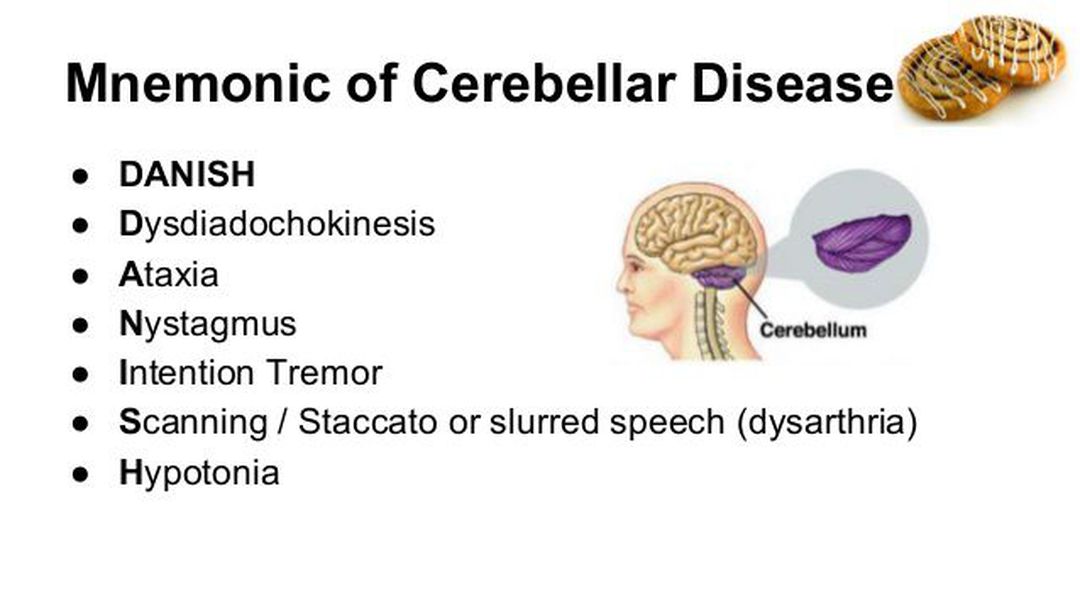 Cerebellum is associated with the control of voluntary movements as well as the posture. Even though cerebellum has no direct control on lower motor neurons, however, it influences the movements indirectly via brainstem and cerebrum. The signs and symptoms of cerebellar disease can be daunting at first. However, the above mentioned mnemonic can make memorization easy. Image via https://www.slideshare.net/shalaree/useful-background-information-for-neurology-revision
