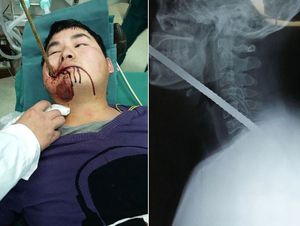 These horrific pictures show how a builder became impaled by a metal rod through his mouth - but survived. The victim said he was working on a building site when he heard a noise above him. When he looked up, the huge iron rod went straight into him, through his mouth and down into his back. X-ray images show just how far the bar penetrated his body. Doctors said the rod had narrowly missed a vital artery in his chest which, if damaged, would have killed him. The bar was removed during a four-hour operation and the patient is now recovering in the hospital with good prognosis. Credit: Steve Robson, Irishmirror