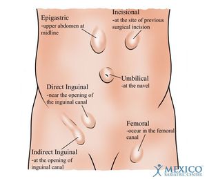Indirect hernia commonly result from herniation of the intestines through the deep inguinal ring.Direct hernias penetrate the A.A.W medial to the inf epigastric vessels through the inguinal triangle (of Hesselbach) and not penetrate the deep inguinal ring.Umbilical hernias exit through the umbilicus .femoral hernias exit through the femoral ring inf to the inguinal lig .Lumbar hernias can penetrate through sup (Grynfeltt)or inf (Petit)lumbar triangles.Epigastric hernia occurs through the widest part of the linea alba