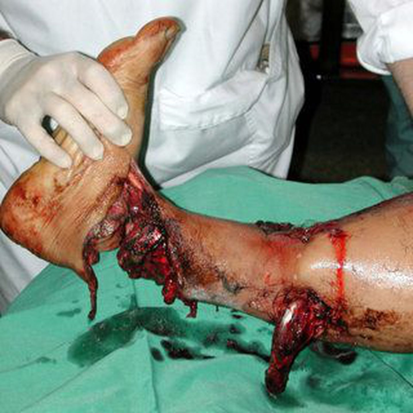 Eighteen-year-old male patient with severe Gustilo type IIIC injury of the ankle after a motorcycle accident.An initial attempt for limb salvage with anastomosis of the posterior tibial artery was followed by delayed amputation 5 days postoperatively due to severe sepsis.