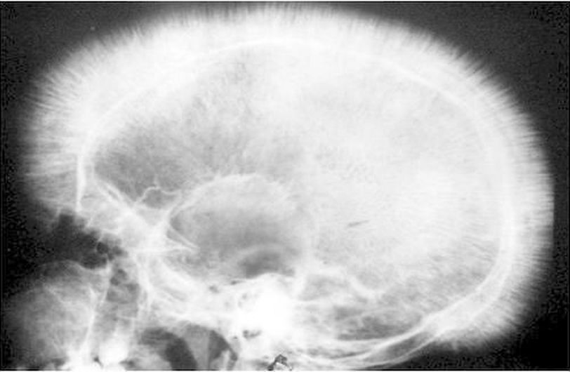 The hair on end sign refers to a radiographic appearance of the diploic space of the skull vault which results from a thickening of trabeculae as the diploic space expands. These trabeculae are perpendicular in orientation, interspersed by radiolucent marrow hyperplasia along with skull vault. This appearance of skull is also known as crew cut. This is classically seen in diseases which require increased erythropoiesis. These diseases can be remembered by mnemonic HI NEST H= Hereditary Spherocytosis I= Iron deficiency anemia N= Neuroblastoma E=Enzyme Deficiency (G6PD Deficiency which leads to hemolytic anemia S= Sickle cell anemia T= Thalassaemia Major Apart from Neuroblastoma, all hyperplasia are caused due to increased erythropoiesis to compete the red cell demand Reference:https://radiopaedia.org/articles/hair-on-end-sign-mnemonic Picture:https://www.stepwards.com/?page_id=877