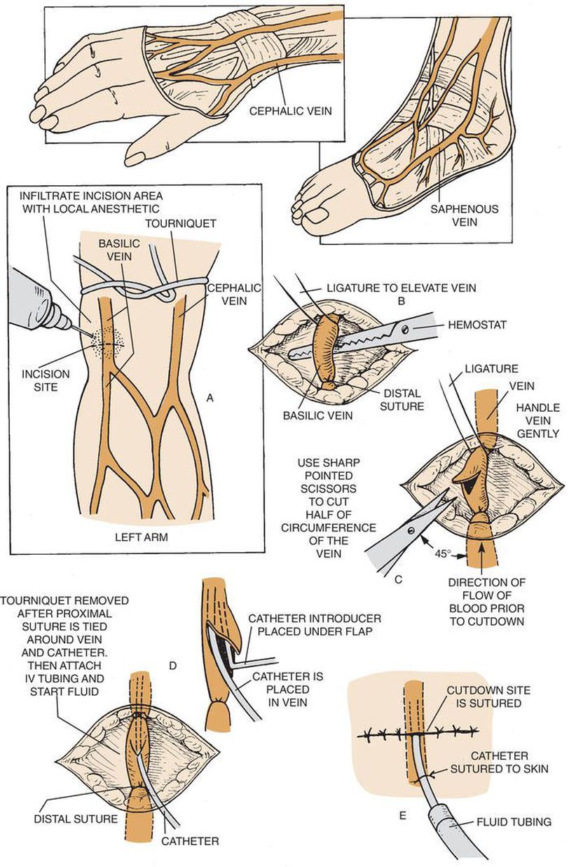 Venous cutdown is an emergency procedure to secure intravenous access. It is used when peripheral veins are not visualized, commonly due to hypovolemia. The procedure carries with it risks of complications including hematoma, cellulitis, thrombophlebitis, damage to neighbouring neurovasculature and has largely fallen out of favour. However, it may still be used in emergency settings when other options have failed or are unavailable. Image credits: https://medical-dictionary.thefreedictionary.com/_/viewer.aspx?path=davisTab&name=v090p0.jpg&url=https%3A%2F%2Fmedical-dictionary.thefreedictionary.com%2Fvenous%2Bcutdown
