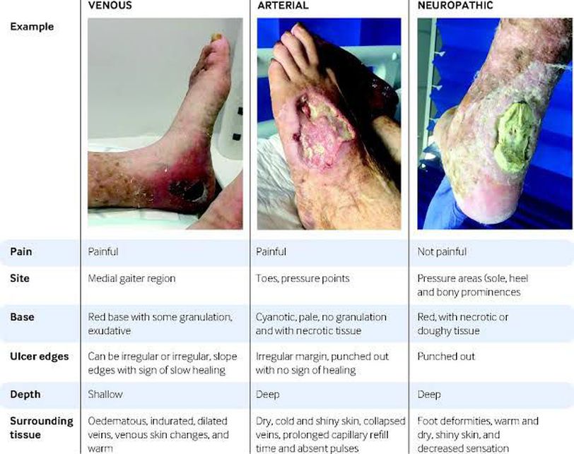 A thorough clinical examination of the ulcer can point out to its etiology. The following table highlights some basic differences in the 3 main types of ulcers encountered in our clinical practice.