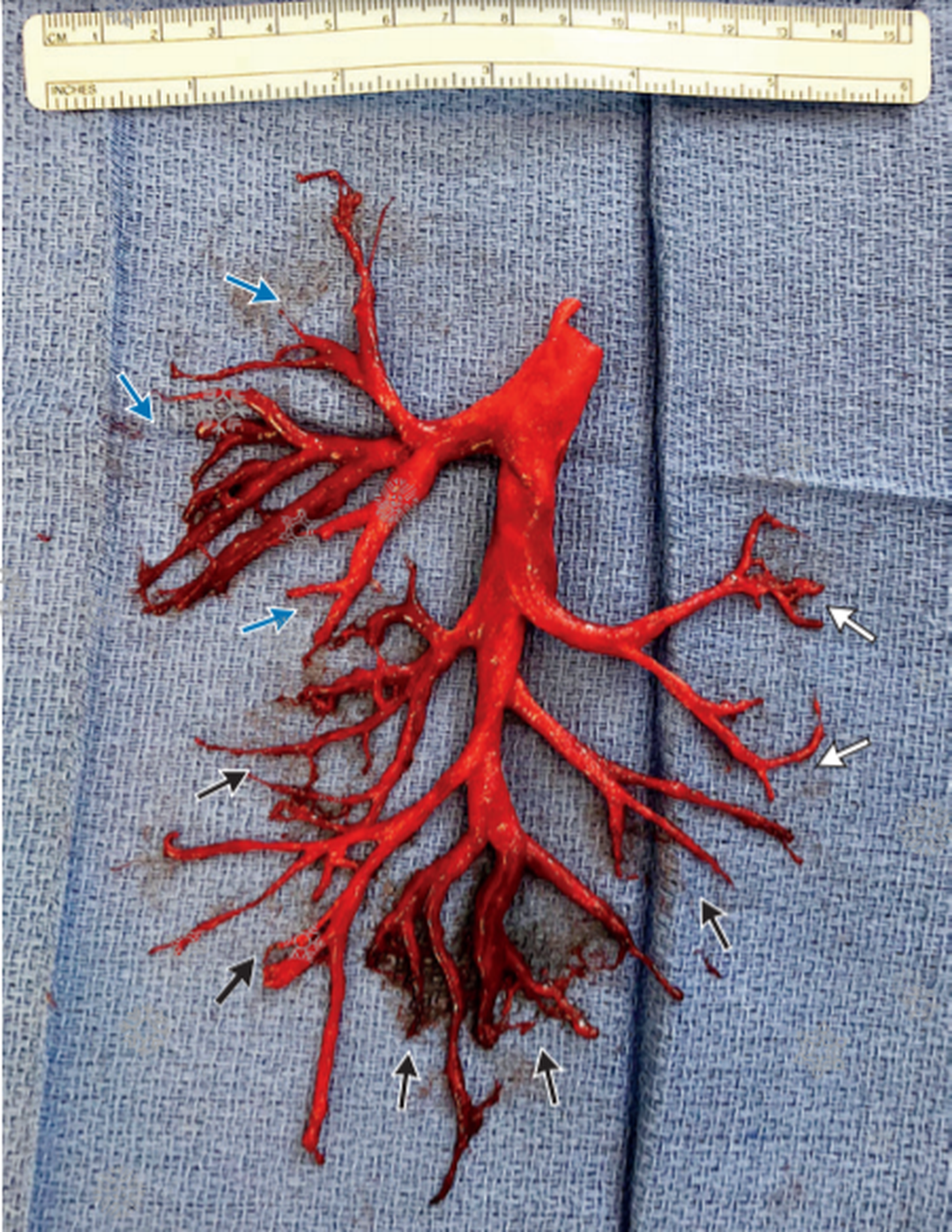 The picture shows the intact cast of right bronchial tree expectorated by a 36-year-old male patient with a history of chronic heart failure, stenting of aortic aneurysm, valve replacement of bicuspid aortic valve, and permanent pacemaker placement for complete heart block. The patient was admitted to intensive care unit due to acute complication of chronic heart failure. The patient was managed by continuous infusion of heparin and insertion of ventricular assist device. The patient had hemoptysis and respiratory distress which was managed by supplemental oxygen. However, during a severe bout of cough, the patient expectorated an intact cast of right bronchial tree. On this cast of right bronchial tree, all segmental branches are prominent. Blue arrows show three segmental branches of upper lobe. The branches of middle lobe are indicated by white arrows. Black arrows show five segmental branches of lower lobe. Patient was intubated. Flexible bronchoscopy demonstrated blood in basilar branches of right lower lobe. Patient was extubated once hemoptysis was relieved. However, patient died a week later due to poor cardiac function and volume overload. Source https://www.nejm.org/doi/full/10.1056/NEJMicm1806493