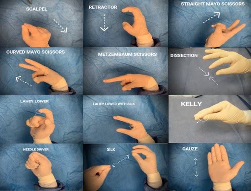 Sign language is an effective alternative, as PPE affects the verbal communication during surgical procedures. Image via: https://cuttingedgeblog.com/2020/06/12/sign-language-for-surgeons-in-the-covid-19-pandemic/amp/