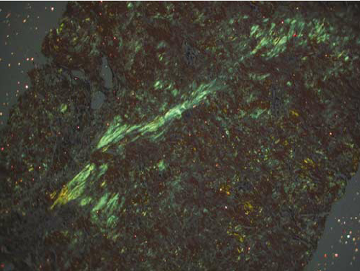 Apple green’ birefringence of the Congo red-positive amyloid material under polarized light at original magnification  400.