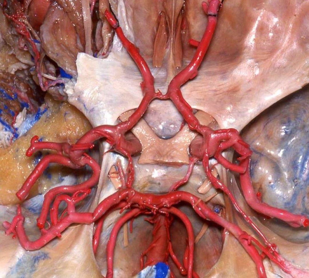 This is a rare specimen of the Circle of Willis — a vascular circuit formed by the anastomoses between branches of the internal carotid arteries (anterior circulation) and vertebral arteries (posterior circulation) around the optic chiasm and pituitary stalk!! The circle of Willis is a polygonal structure of blood vessels present at the base of brain which distributes oxygen-rich arterial blood to the cerebral mass. The base of the brain is the place where the vertebro-basilar system and internal carotid system of vessels meet or anastomose. The anastomosis of these two systems occurs in the interpeduncular cistern and forms an arterial circle called ‘Circle of Willis’. These vessels branch from the internal carotid arteries on each side, which branches laterally into the middle cerebral artery that gives branches toward the front and back of the brain, into the anterior and posterior cerebral arteries. These paired arteries are interconnected and communicating, thus giving us the shape of a circle. The middle cerebral artery is often invoked in the case of stroke, aneurysms, and rupture which subsequently leads to intracranial bleeding (subarachnoid hemorrhage) and is an emergency situation. Most saccular cerebral aneurysms, also known as berry aneurysms, occur in the anterior circulation of the brain, usually at the junction of the anterior cerebral artery and the anterior communicating artery in the circle of Willis. They are the most common cause of nontraumatic subarachnoid hemorrhage