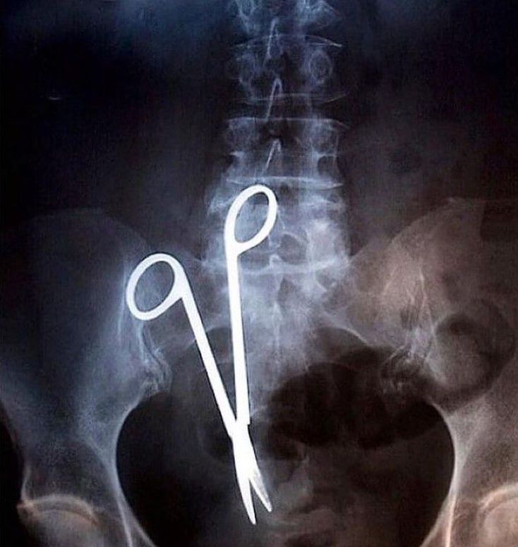 A middle aged woman who had an abdominal surgery 18 months ago kept complaining about the persistent abdominal pain.A pair of 6.7 inch long surgical scissors were found in the X-ray. Image via : https://www.instagram.com/p/CJgACUXHE7-/?igshid=1c8ku6ahlw2xi