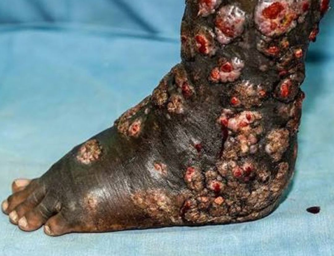 Eumycetoma is a chronic granulomatous fungal disease of humans, affecting mainly the limbs, and sometimesthe abdominal and chest walls or the head. Mycetoma pedis (mycetoma of the foot), the most common form of mycetoma, is known widely as the Madura foot. The infection is endemic in Africa, India and Central and South America.The disease is also found in other areas but not on an endemic scale. Signs and symptoms The initial lesion is a small subcutaneous swelling following minor trauma. Later, sinuses that discharge purulent and seropurulent exudates containing grains which are fungal colonies are formed.Destruction of deeper tissues, and deformity and loss of function in the affected limbs may occur in later stages. Diagnosis Diagnosis of mycetoma is usually established clinically in endemic areas. X rays and ultrasonography may be employed in evaluating the extent of the disease. X rays findings are extremely variable. The disease is most often observed at an advanced stage that exhibits extensive destruction of all bones of the foot. Rarely, a single lesion may be seen in the tibia where the picture is identical with chronic osteomyelitis. Cytology of fine needle aspirate or pus from the lesion, and tissue biopsy may be undertaken sometimes. Some publications have claimed a "dot in a circle sign" as a characteristic MRI feature for this condition (this feature has also been described on ultrasound). Causes Mycetoma may be caused by bacteria from the phylum Actinomycetes, or by fungi (Eumycetes) where it is called eumycetoma. Treatment Drugs like ketoconazole, voriconazole,and itraconazole are generally employed in treating the infection. Actinomycetes usually respond well to medical treatment, but the eumycetes are generally resistant and may require surgical interventions including salvage procedures as bone resection or even the more radical amputation.