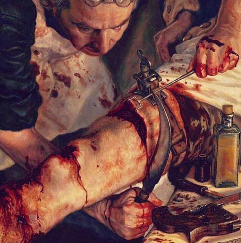 In this painting the surgeon is using falciform amputation knife to cut off the flesh before amputating the the bone. All these procedures were done without anaesthesia.