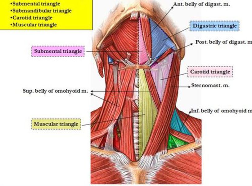 Anterior triangle of the neck is formed by the anterior border of sternocleidomastoid laterally, an imaginary line in the midline medially and the inferior border of mandibular ramus superiorly. It is further divided into the triangles mentioned above. All these triangles provide important landmarks for surgical procedures of the neck such as removal of malignant lymph nodes. Source: https://quizlet.com/342873174/anterior-triangle-of-the-neck-l4-flash-cards/