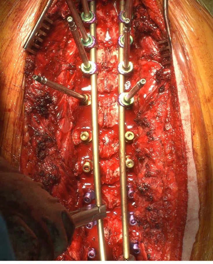 ⚠️ Intraoperative view of scoliosis surgery. Scoliosis is a medical condition in which a person's spine has a sideways curve. The curve is usually "S"- or "C"-shaped. In some the degree of curve is stable, while in others it increases over time. Mild scoliosis does not typically cause problems, while severe cases can interfere with breathing. The cause of most cases is unknown but believed to involve a combination of geneticand environmental factors. It can also occur due to another condition such as muscles spasms, cerebral palsy, Marfan syndrome, and tumors such as neurofibromatosis. Diagnosis is confirmed with plain X-rays.