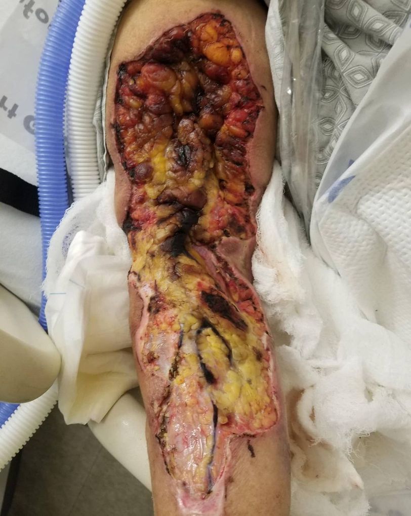 That looks like an adriamycin extravasation. I have also seen calcium do this when someone unwisely used a foot vein in an adult. The patient lost her foot over it. This is why PICC lines and ports are better choices for vesicants.