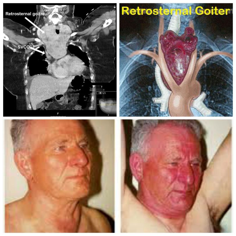 Etiology; ..retrosternal extension of the cervical thyroid goiter OR ..ectopic thyroid tissue in the thorax Presented by ;mediastinal syndrome (,compression manifestations) like dyspnea , dysphagia, hoarseness of voice, unequal pulse, congested neck veins, congested face, puffiness of eyelids, Pemberton sign ..ask the patient to raise his arms wirh some neck flexion for 3 minutes leading to congestion of face and respiratory distress If you percuss over the manubrium sterni , you can feel dullness Ttt..if it's malignant ;total thyroidectomy ..if simple goiter; subtotal thyroidectomy ..if toxic goiter; subtotal thyroidectomy but after preoperative preparation by B blockers