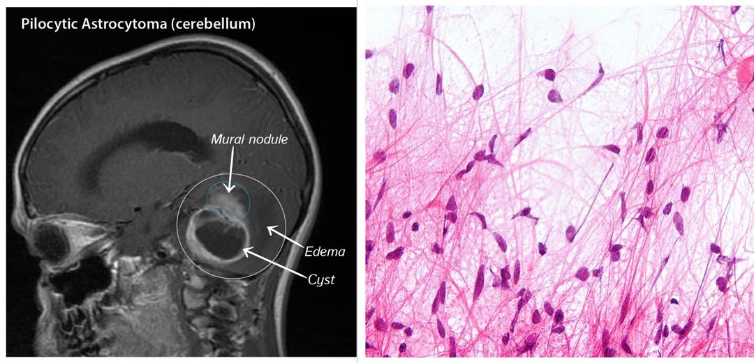 Pilocytic astrocytoma is a neoplasm of the brain arising from astrocytes in children. It is a low-grade tumor (I/IV). The most common location is below the tentorium i.e., cerebellum. It is less commonly found on the floor of the third ventricle or cerebral hemisphere. Two types of alteration in the BRAF gene are implicated in pilocytic astrocytoma: 1. Translocation of a gene separates the kinase domain and the inhibitory domain. 2. Activating mutations of V600E genes Pilocytic astrocytoma may also occur due to loss of function of the neurofibromin gene associated with neurofibromatosis type I. Morphologically, pilocytic astrocytoma range from cystic appearance to solid, well-circumscribed mass. The hair-like processes are the characteristic finding demonstrated on histopathology. These fibers are called Rosenthal fibers. They form fibrillary meshwork which is GFAP-positive. Tumors are usually treated by surgical resection. It has a good prognosis. Source Robins and Cotran Pathological Basis of Disease Image via https://en.wikipedia.org/wiki/Pilocytic_astrocytoma & https://www.drawittoknowit.com/course/pathology/glossary/pathophysiologic-disorder/pilocytic-astrocytoma